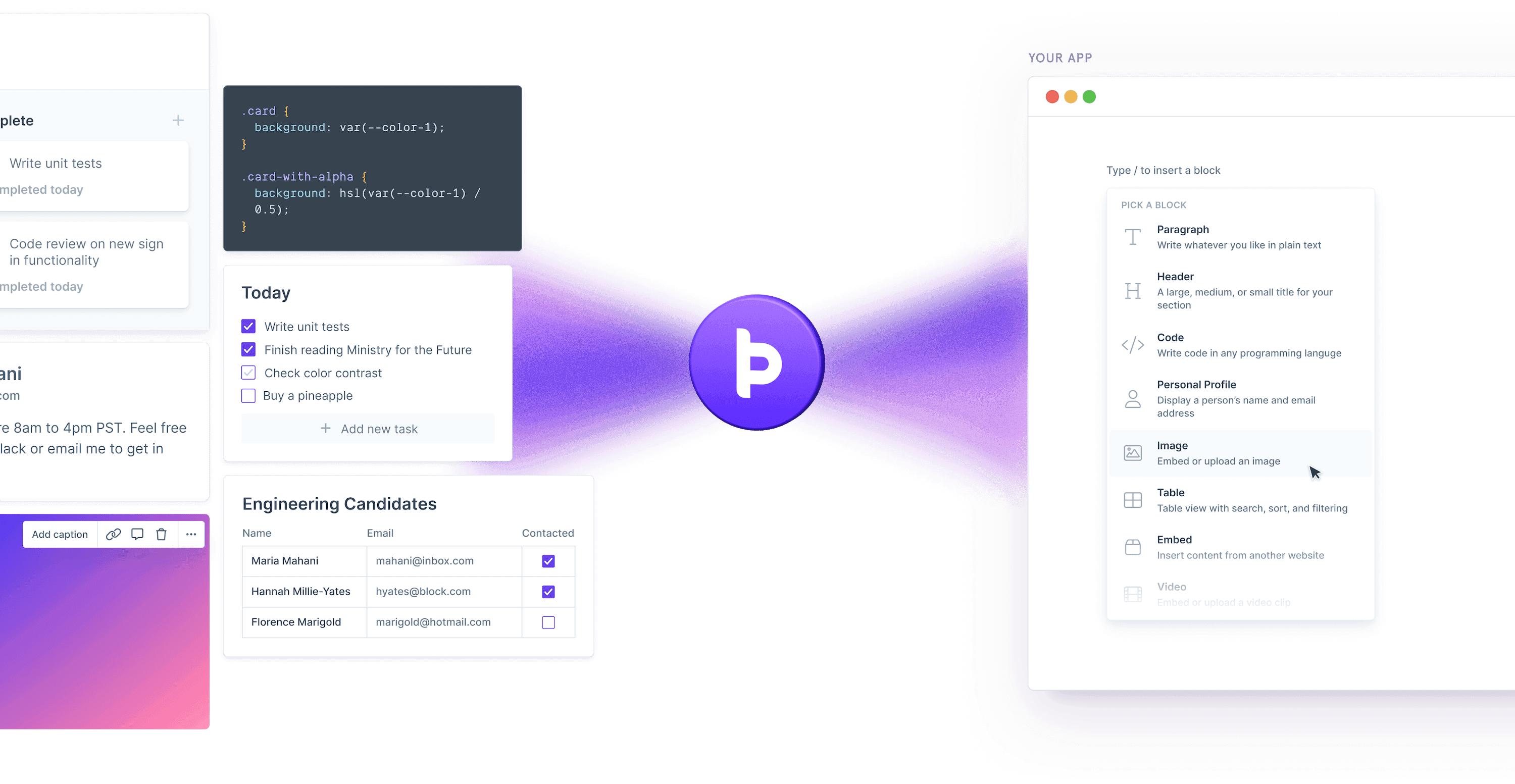 As a developer, building your applications using the Block Protocol will give you access to a global registry of reusable, flexible blocks to embed.